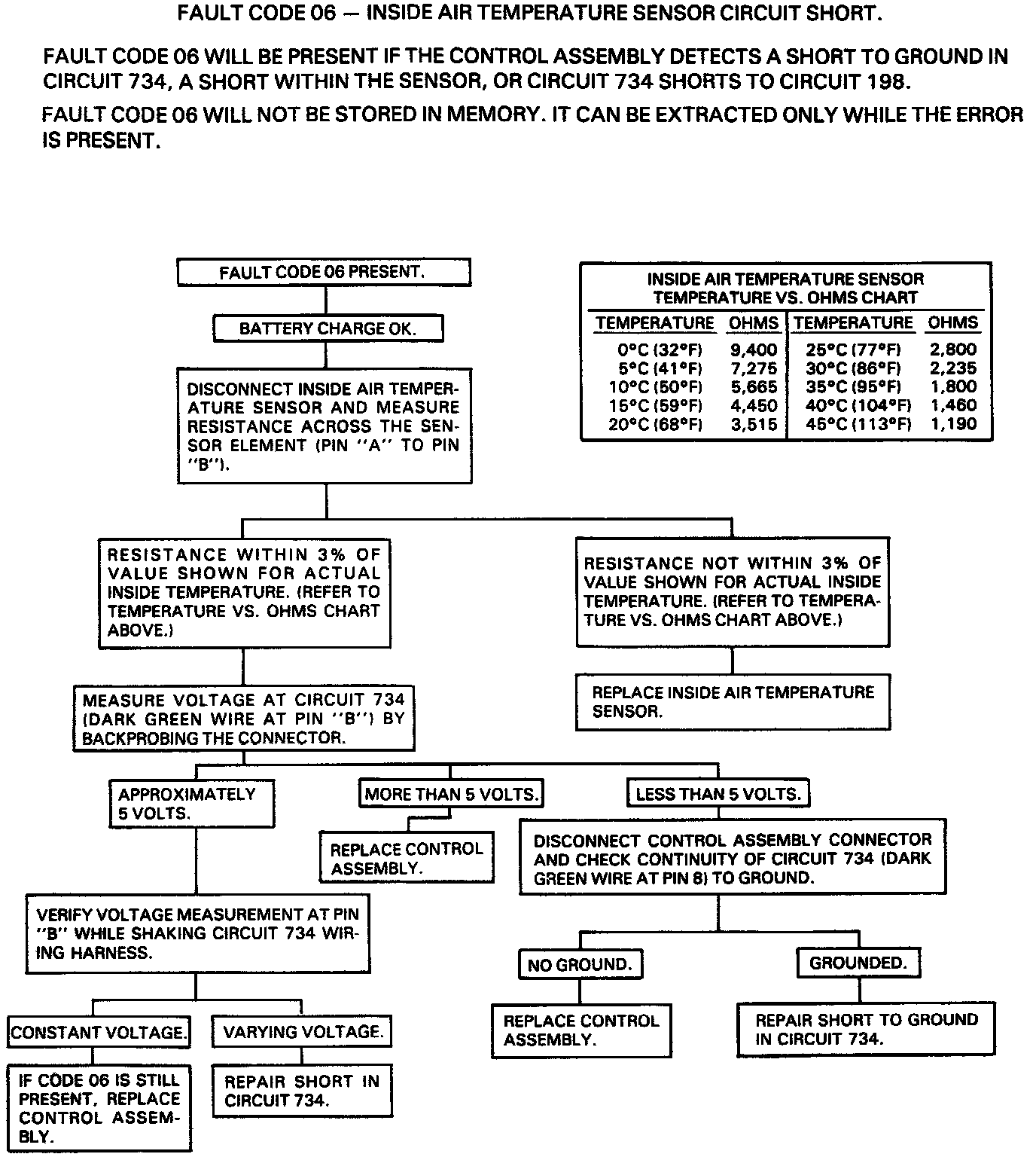 The microprocessor (15) supplies a reference voltage (about 5 volts) on CKT 734 to the sensor. When the inside air temperature is cold, the thermistor resistance is high; therefore, the microprocessor (15) will receive a high signal voltage input. If the inside air temperature is high, the thermistor resistance is low; therefore, the microprocessor (15) will receive a low signal voltage input.