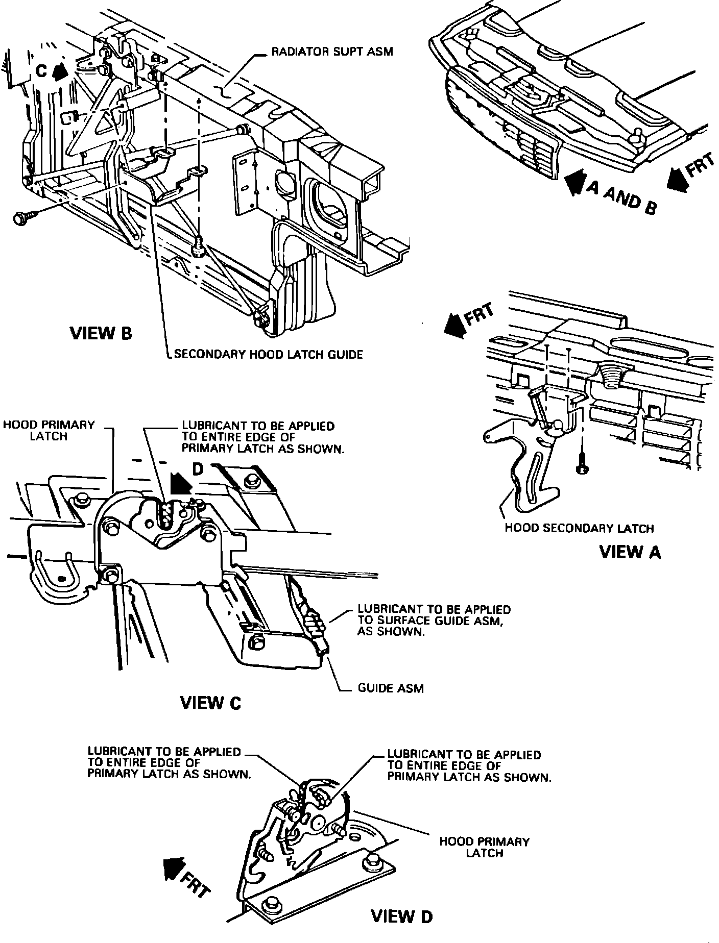 6. Apply coating of chassis grease (GM # 1052497 or equivalent) to the primary hood latch pawl and contact areas of the hood striker (See Views C and D of the Illustration).