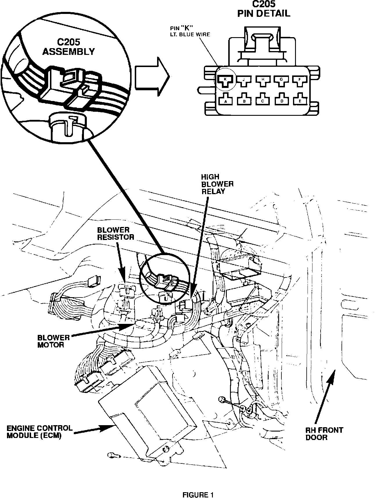 3. Cut the wire (Lt. Blue) located in Pin K of connector C205 (Figure 1). Tape the cut wires back to the wire harness.