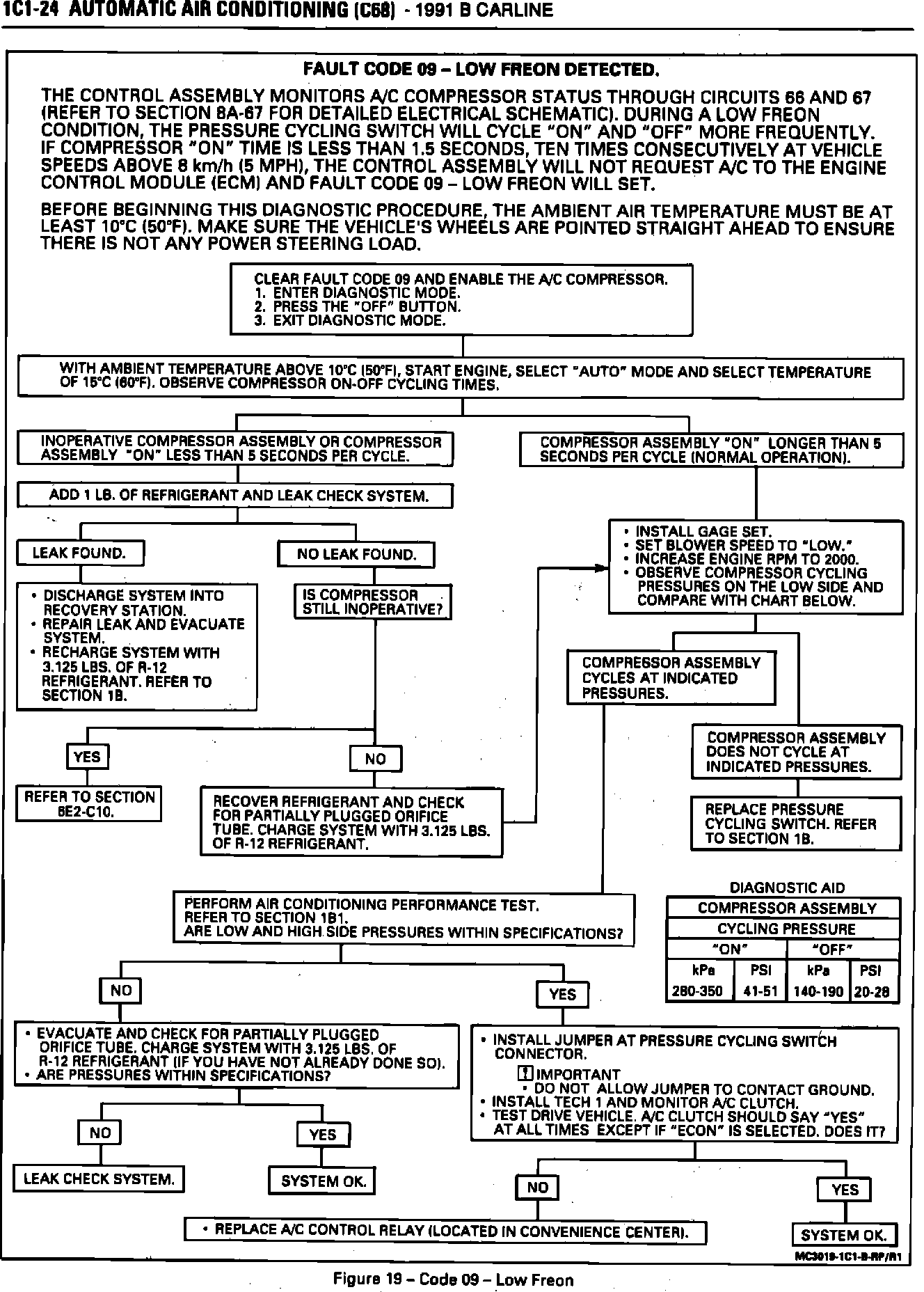 This new procedure replaces Figure 19 or 20 - Code 09 Low Freon Detected" in Section 1C1 of the 1991 service manual and Section 1C of the 1992 service manual.