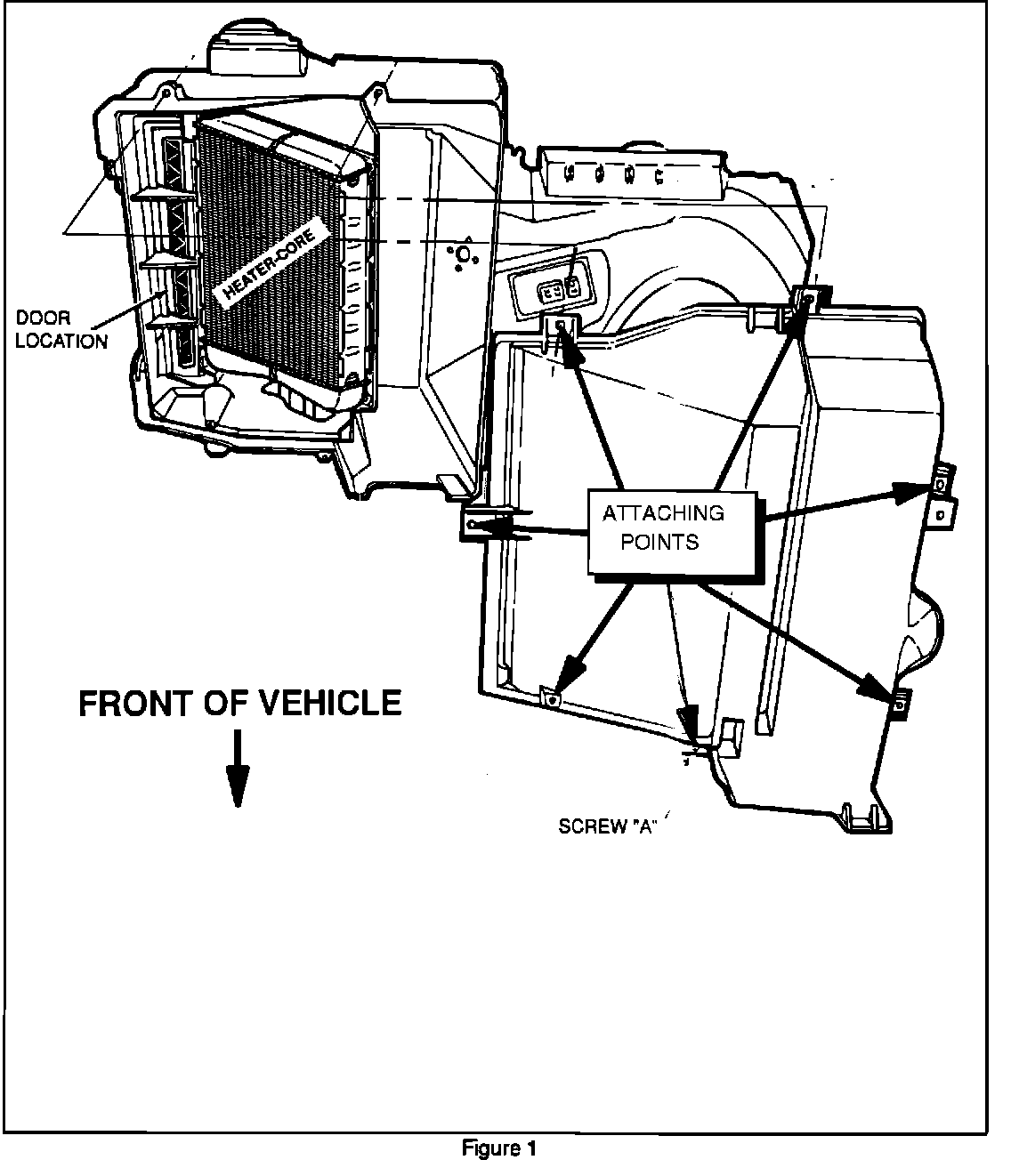 1. Remove A/C Module Lower Evaporator Case per Service Manual, Section 1B. Front screw may be hidden by carpet and difficult to access. Use of a 7 mm flex head socket may be helpful. (See Figure 1 for attaching points.)