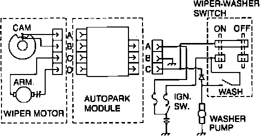 1. To test for proper motor operation, disconnect wiring harness and apply 12 volts to terminals A and C of autopark module and ground terminal B, Fig. 55. Motor should run.