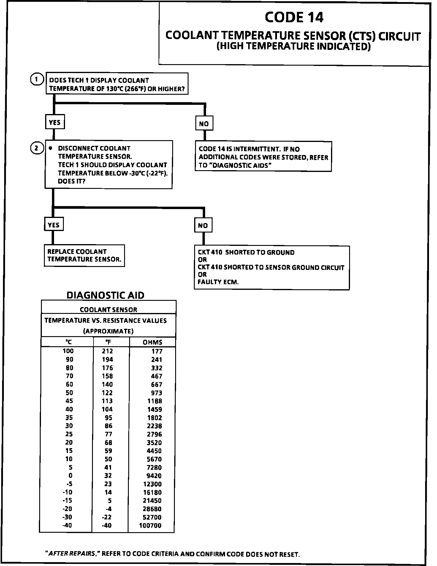 2. This test will determine if circuit 410 is shorted to ground which will cause the conditions for Code 14. If a code 14 is set, the ECM will use a default coolant temperature value of 49°C (120°F) for fuel control. Scan tool will read actual value not default value.