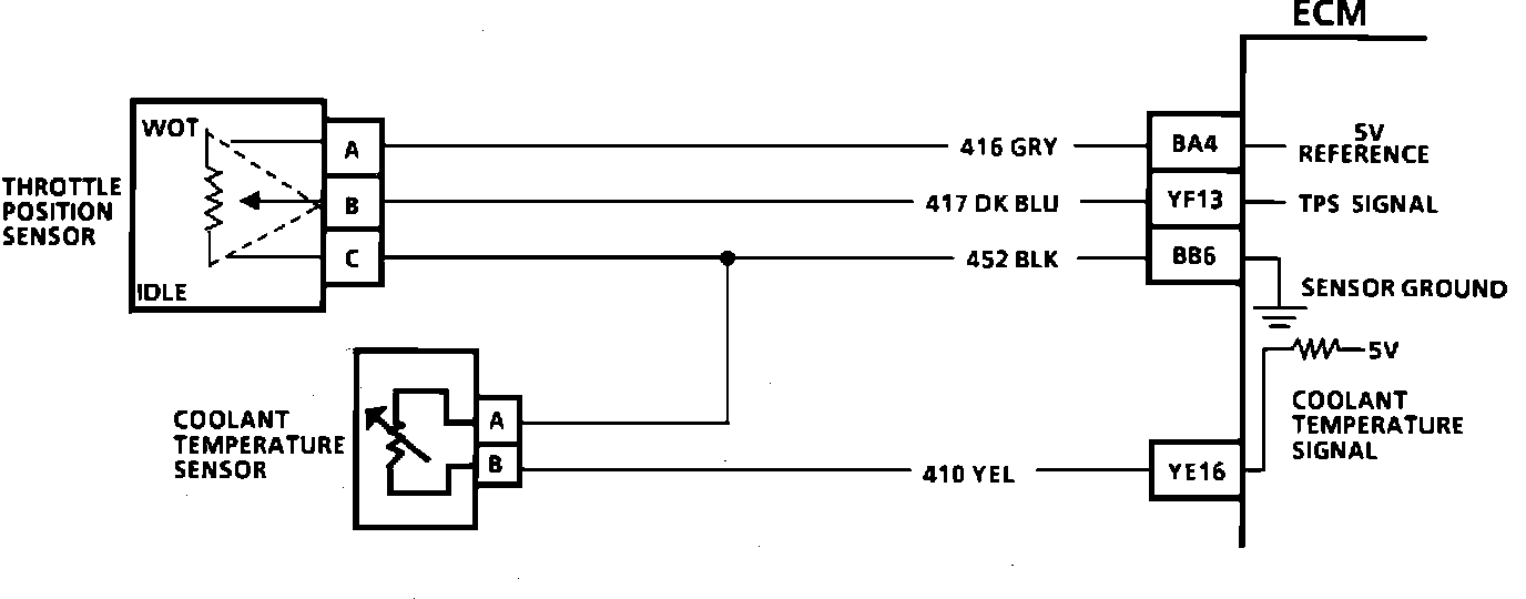 As the engine warms, the sensor resistance becomes less, and the voltage drops. At normal engine operating temperature, the voltage will measure about 1.5 to 2.0 volts at the ECM.