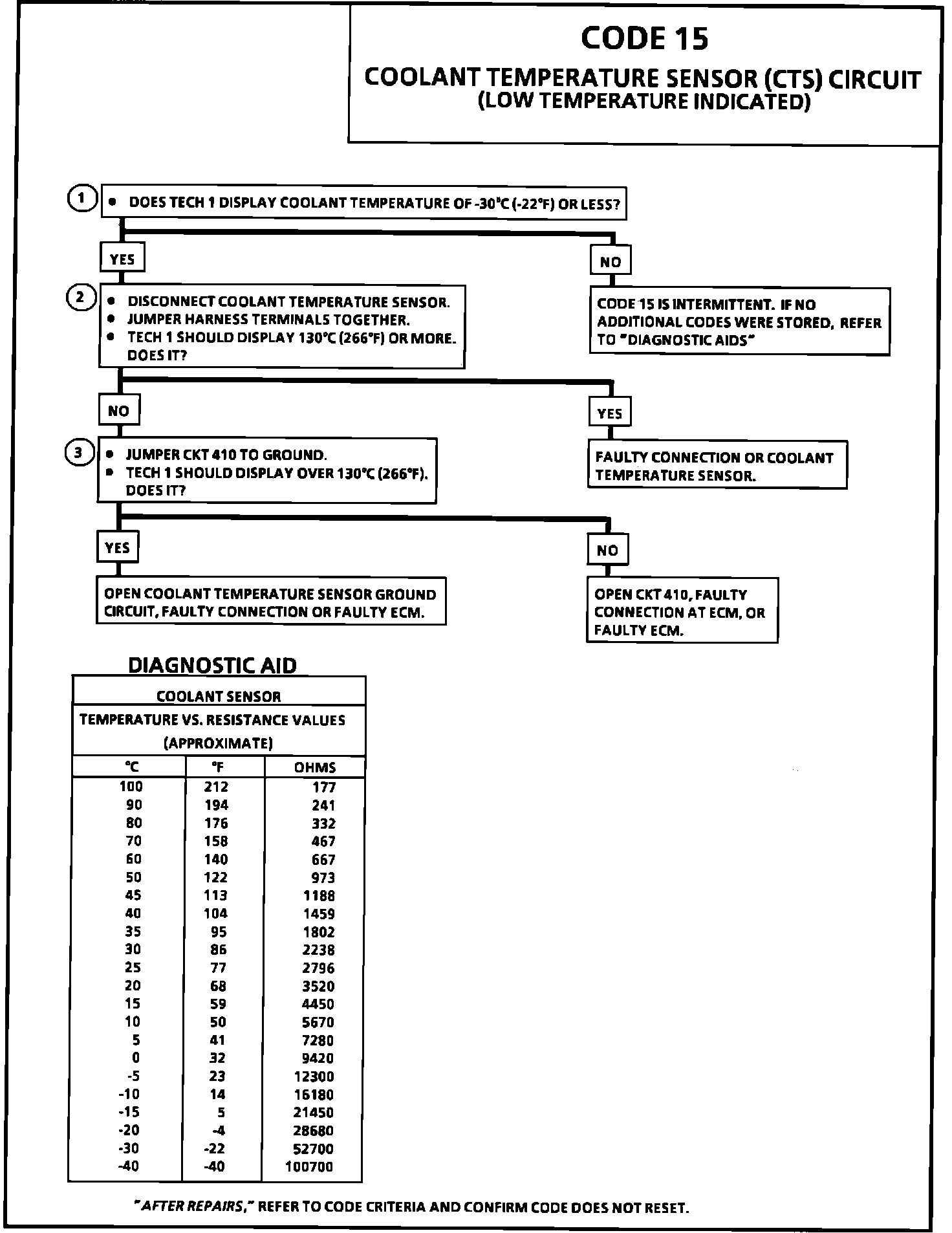 3. This test will determine if circuit 410 is open. There should be 5.0 volts present at sensor connector if measured with a DVM. If Code 15 is set, the ECM will use 49°C (120°F) for fuel control. "Scan" tool will display actual value.