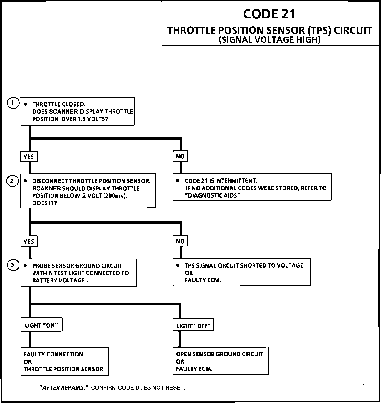 2. With the TPS disconnected, the TPS voltage should go low and a Code 22 will set. Therefore, the ECM and wiring are OK.