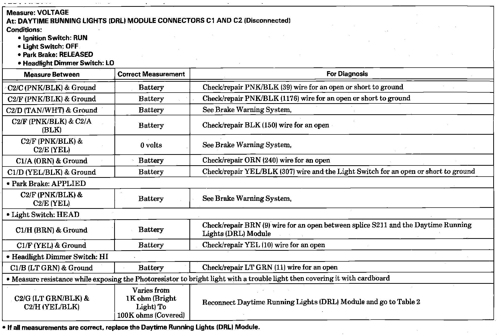 Test A: Daytime Running Lights Module Test (Table 1):