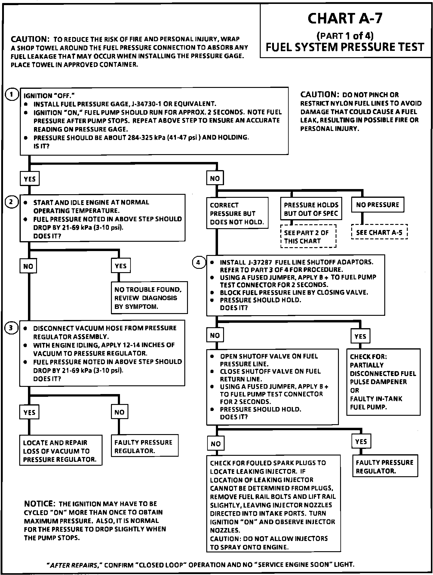1. Install pressure gauge J-34730-1 or equivalent to fuel pressure tap. Wrap a shop towel around the fuel pressure tap to absorb any leakage of fuel that may occur when installing fuel pressure gauge. With ignition "ON," pump pressure should be 284-325 kPa (41-47 psi). This pressure is controlled by spring pressure and throttle body vacuum within the pressure regulator assembly. Pressure should not leak down after the fuel pump is shut "OFF."