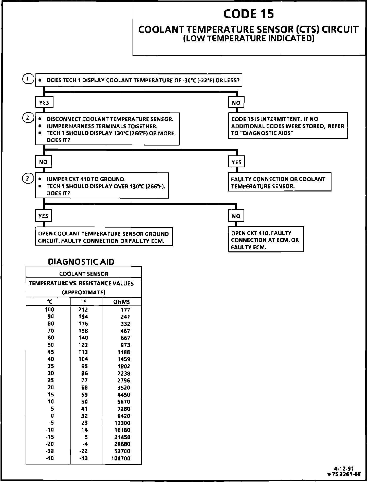 ^ A faulty connection or an open circuit 410 or 808 will result in a Code 15. Codes 15 and 21 stored at the same time may be the result an open ground circuit 808, which would also turn the temperature warning light "ON"