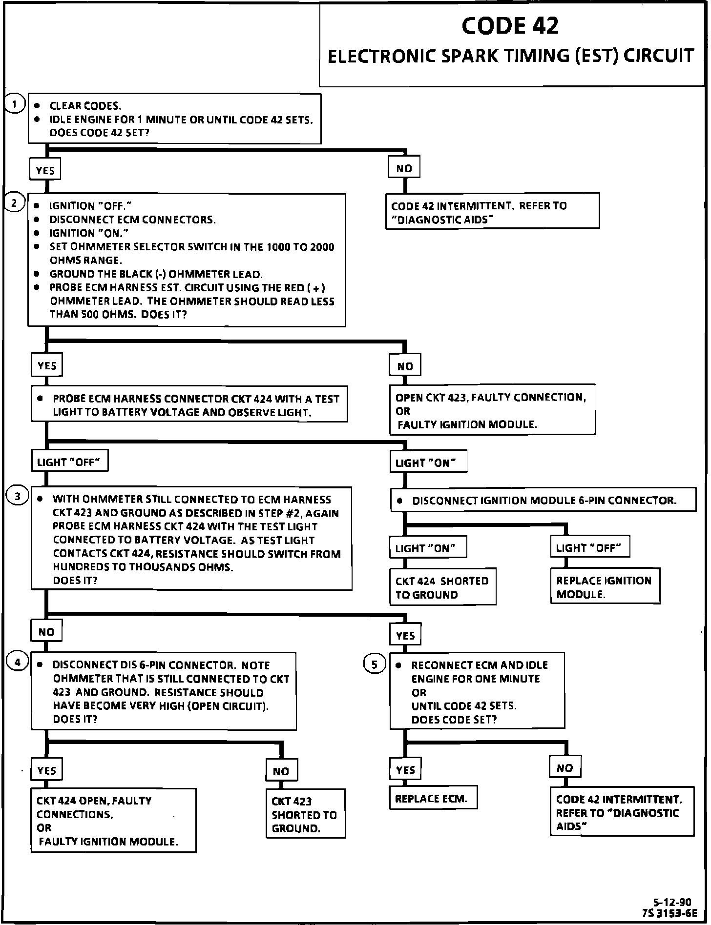 When the system is running on the ignition module, that is, no voltage signal on the bypass line (module mode), the module grounds the EST circuit. The PCM expects to see zero volts on the EST circuit during this condition. If it sees a voltage, Code 42 is set and the PCM will not switch to EST mode.