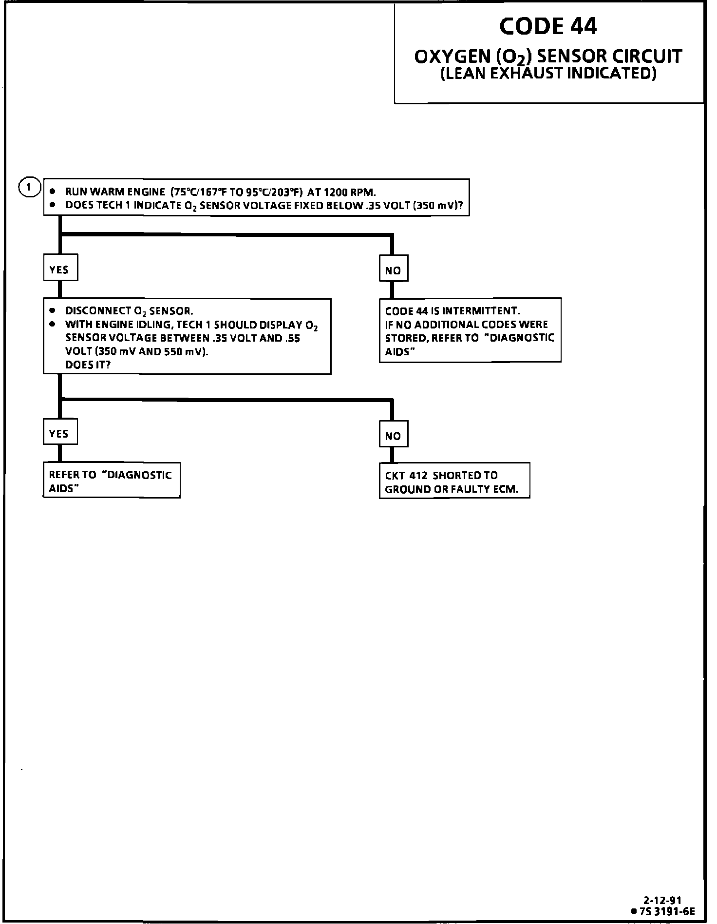 ^ Injectors - Plugged or restricted may cause lean condition in one or more cylinders. If one cylinder is too lean or not firing, the oxygen in the exhaust from that one cylinder may cause a lean exhaust indication. This may cause the system to go to full rich and set a Code 44, as the computer tries to compensate for the one bad cylinder. Perform injector ballance test. Chart C-2A Fuel Injector Balance Test