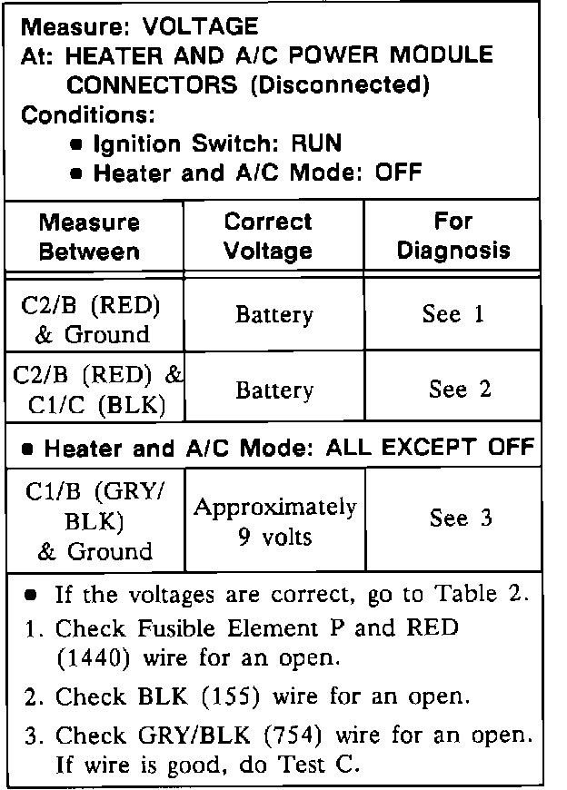 Test B: Heater And A/C Power Module Test (Table 1):
