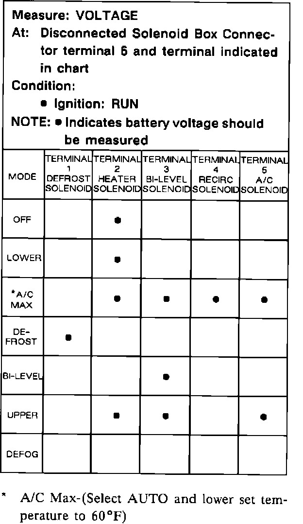 ^ Use the table to check for proper operation of the Heater and A/C Control Assembly Solenoid Controls. To use the matrix, connect a voltmeter to terminal 6 of the Solenoid Box and to the terminal indicated in the table. Battery voltage should be measured at the terminals indicated with a dot.