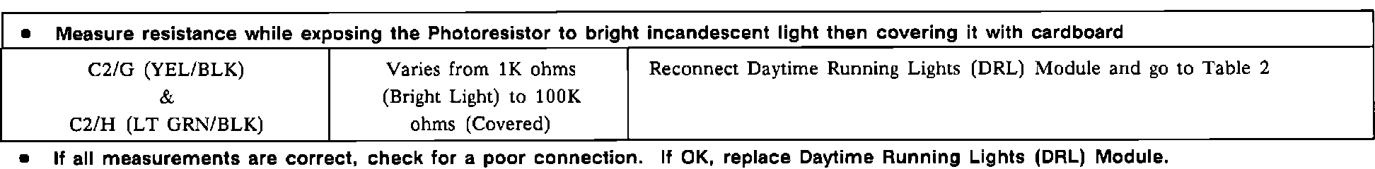 Daytime Running Lights (DRL) Module Test (Table 1):