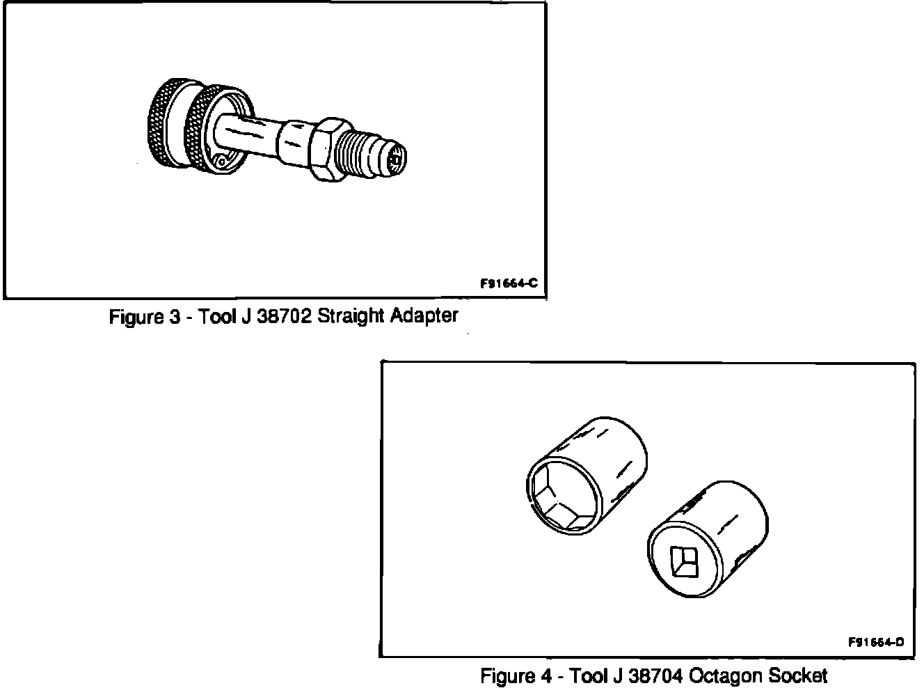 Tool J 38702 (Figure 3), is a straight adapter which allows existing diagnostic equipment to be connected to the service port, and high side pressures to be checked by opening the port. The adapter connects, first to the gage hose and then to the high side pressure port, by threading the adapter to the port.