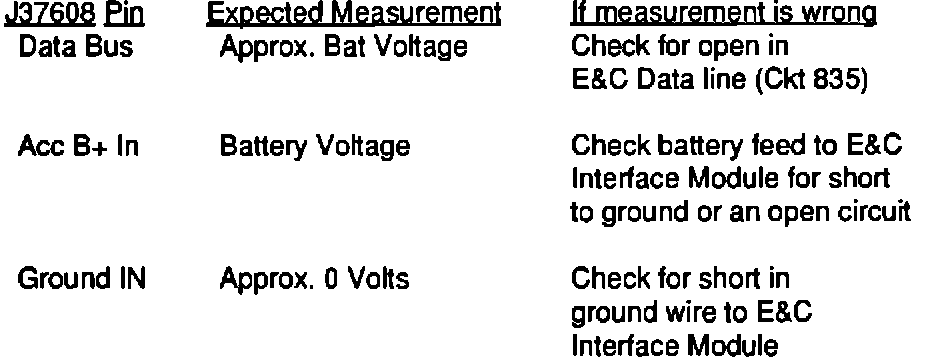 There are two boxes that instruct you to "Replace the E&C Interface Module". Before replacing the module, check the battery, ground, and E&C data circuits that connect to the module. Ignition switch "OFF". Remove the jumper harnesses from J37608. Connect the Radio & HVAC Interface Module portion of the Turn Signal Switch harness to J37608. With the Ignition Switch in Run, make the voltage measurements at the E&C Interface half of J37608: