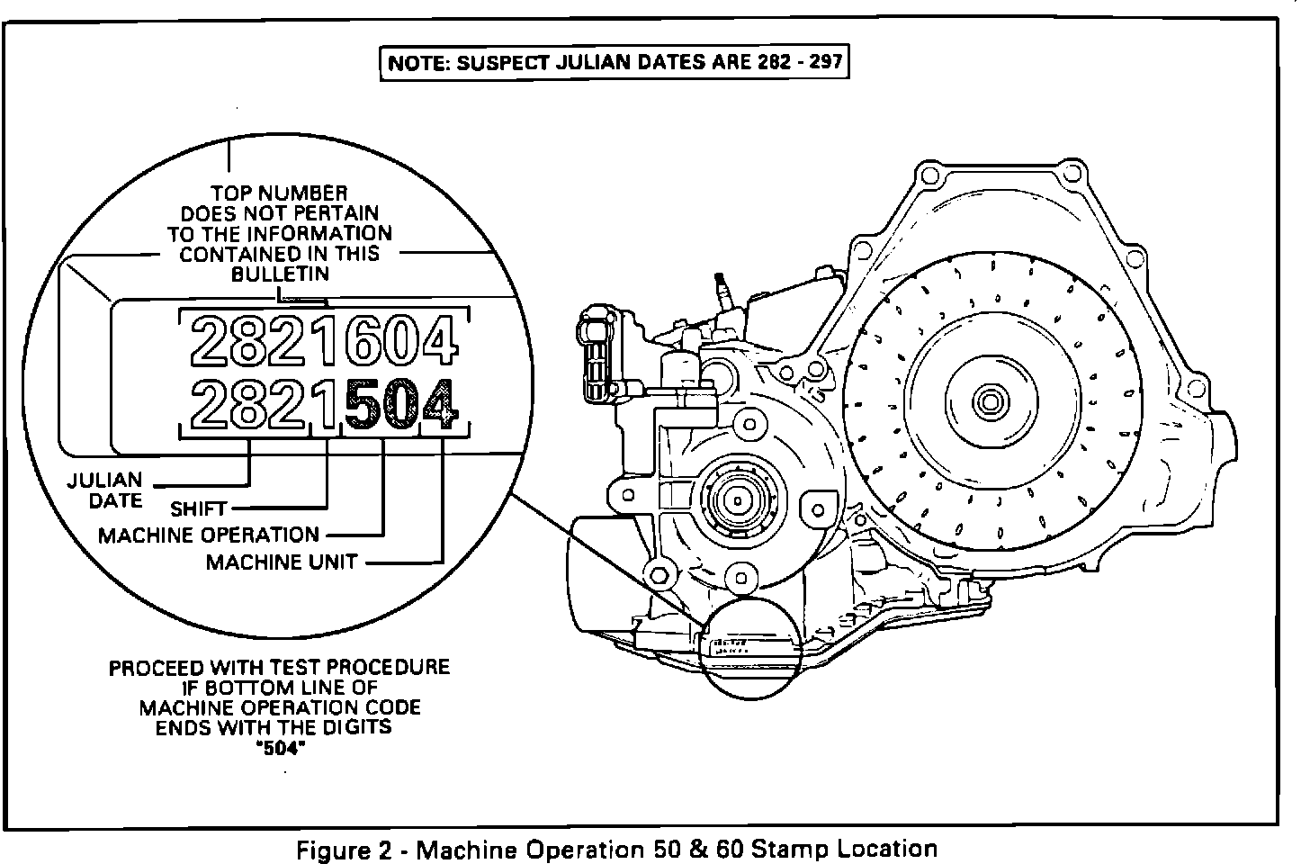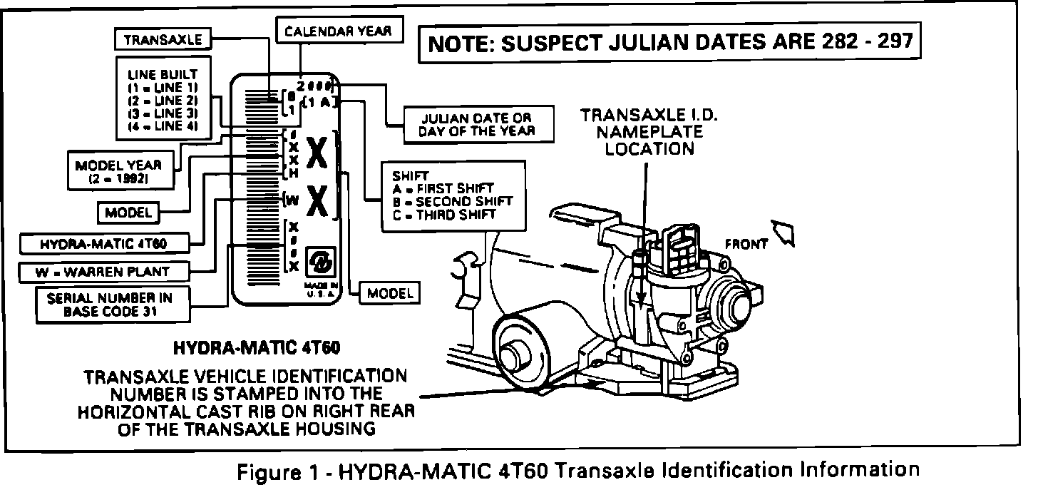 2. Lift the vehicle, following all safety precautions, and ensure the vehicle is properly supported (see section 0A of appropriate 1992 Oldsmobile Service Manual). Inspect the transaxle ID plate (Figure 1) and the case machining stamp (Figure 2) to determine if the vehicle needs to be tested.