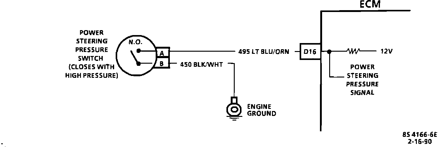 The PCM applies a 12 volt reference voltage through a resistor to the Power Steering Pressure Switch (PSPS), and then monitors the voltage in the circuit. When the power steering pressure goes high, the PSPS closes, grounding the circuit and causing the measured voltage to drop to nearly zero. This indicates a power steering load on the engine. The PCM responds to this indication by disengaging the A/C compressor clutch and increasing the IAC valve counts, to compensate for the additional load on the engine during idle.