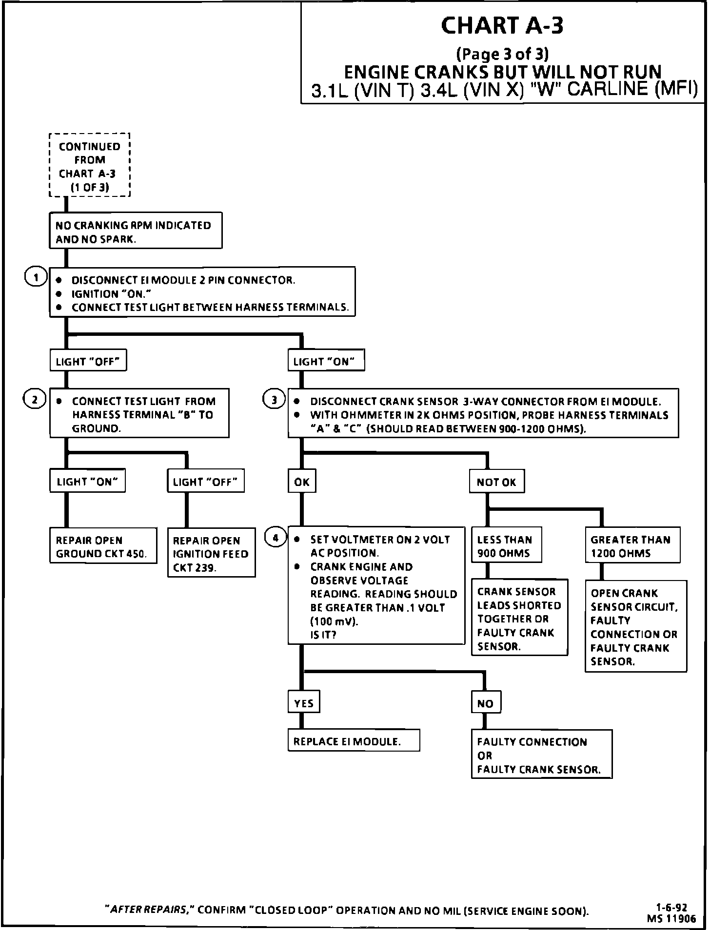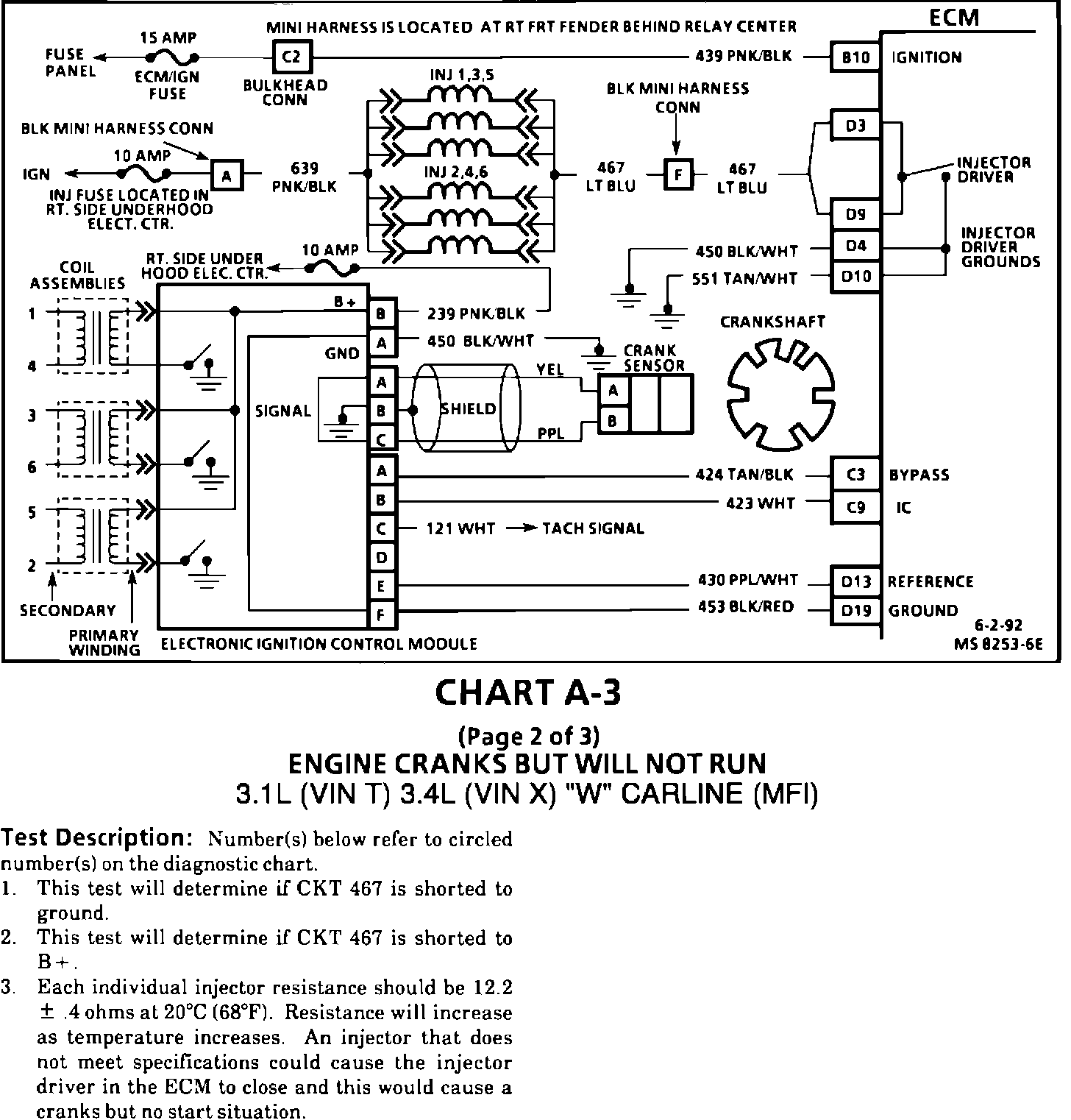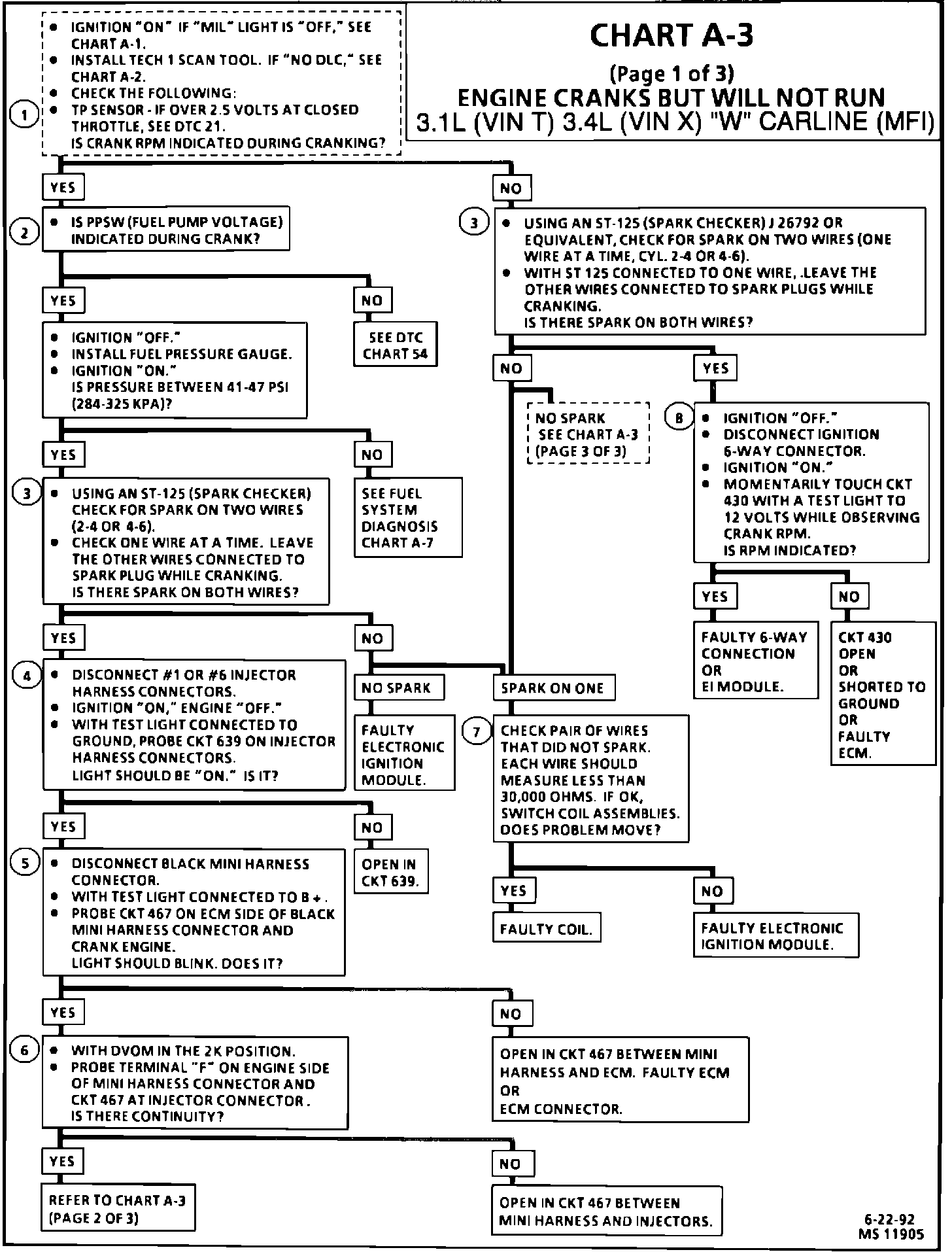 This Bulletin contains revisions to Section 6E3 of the 1991-92 "W" Carline Service Manuals The 3.1L (VIN T) and 3.4L (VIN X) Engine Cranks But Will Not Run (Chart A-3) has been revised. These revised pages will replace the current Chart A-3 pages in the following service manuals.