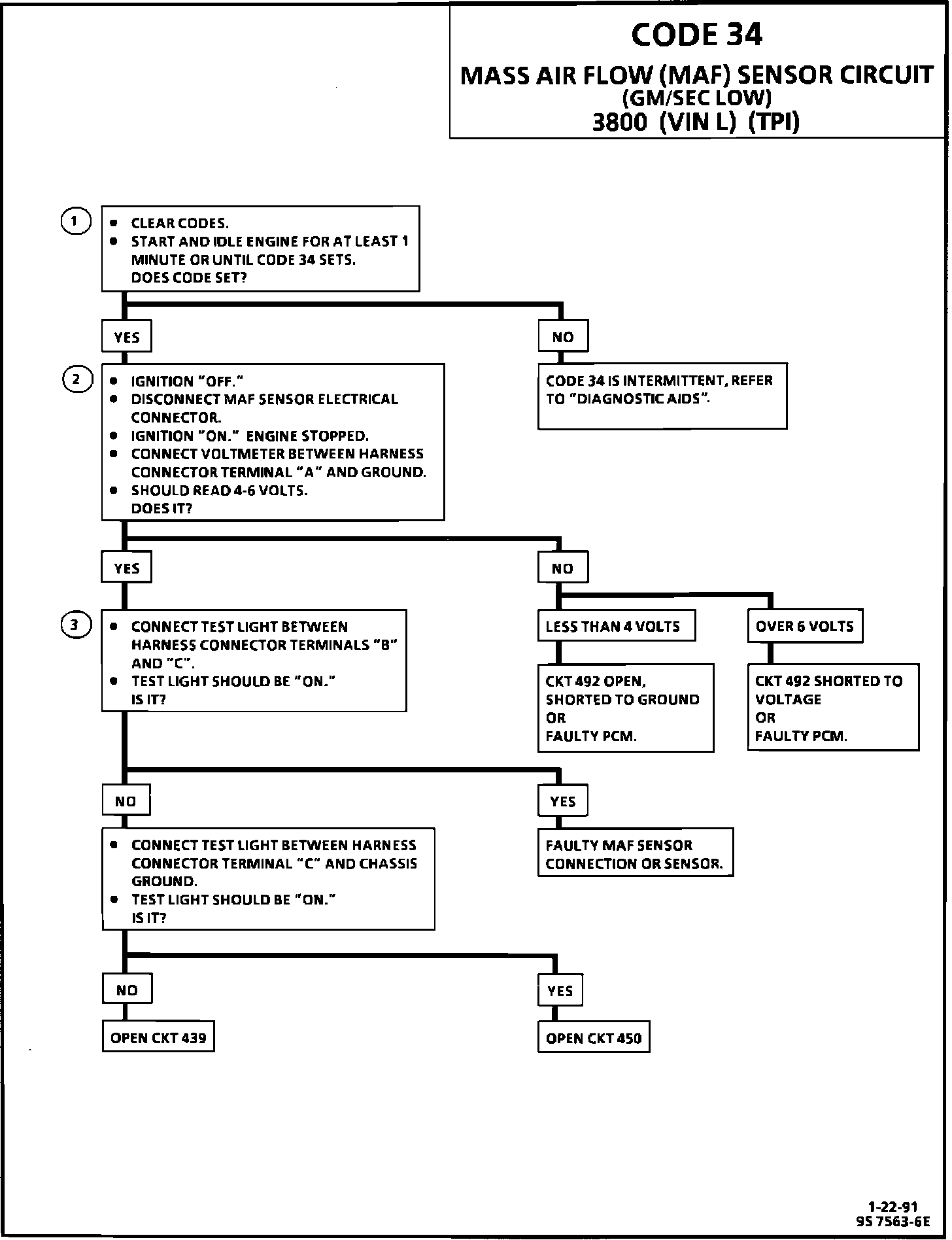 2. A voltage reading at sensor harness connector terminal "A" of less than 4 or over 6 volts indicates a fault in CKT 492 or poor connection.