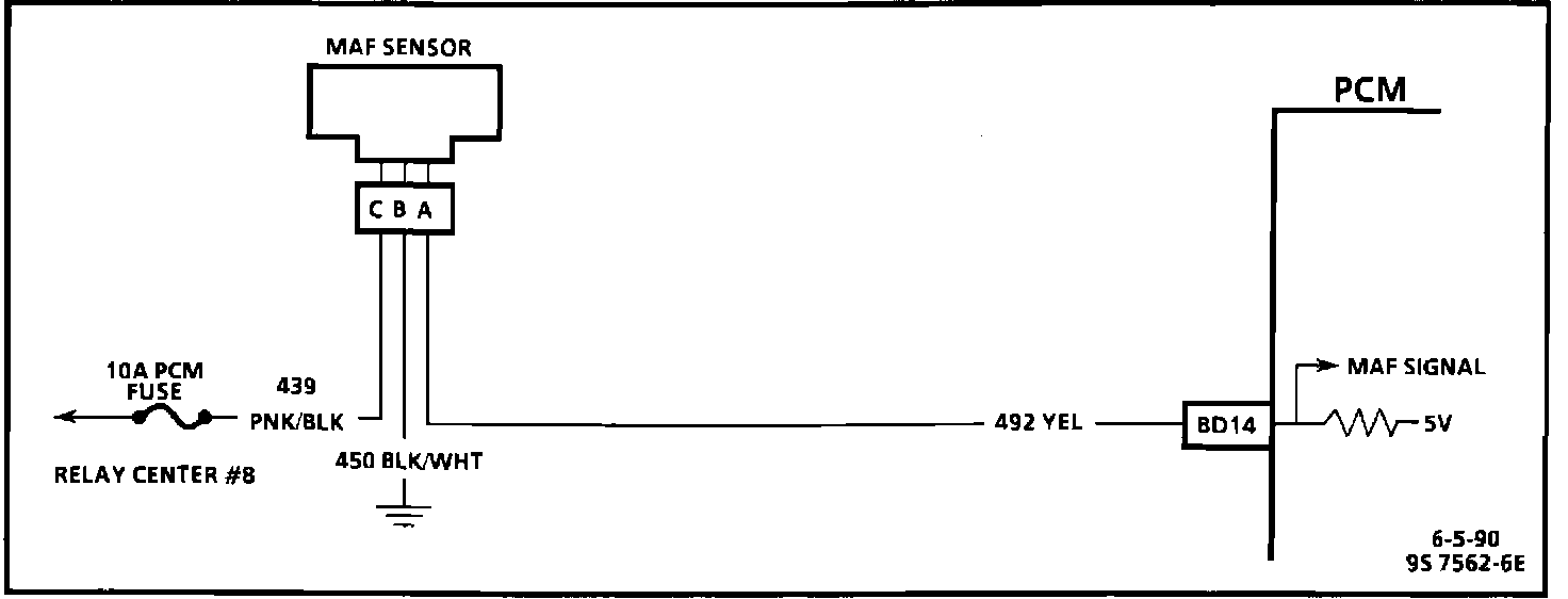 The mass air flow (MAF) sensor measures the flow of air which passes through it in a given time. The PCM uses this information to monitor the operating condition of the engine for fuel delivery calculations. A large quantity of air movement indicates acceleration, while a small quantity indicates deceleration or idle. The MAF sensor produces a frequency signal which cannot be easily measured. The sensor can be diagnosed using the procedures on this chart.