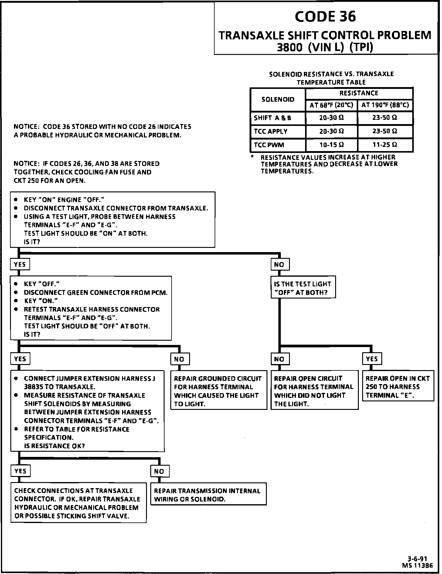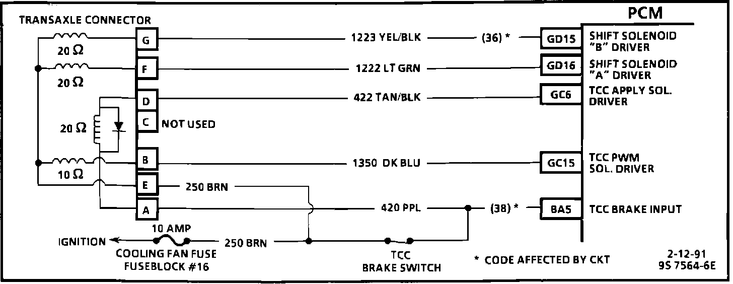 NOTE: When code 36 is set, the transaxle will be forced into 3rd gear. If a code 36 is set due to a grounded CKT 1223, you will have 1st, and 2nd gear operation only. If CKT 1223 is open, you will have 3rd and 4th gear operation only. When the fault goes away, you will have normal operation for the balance of the key cycle.