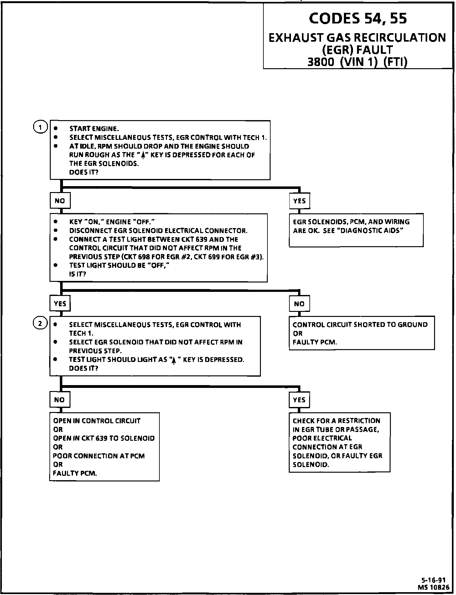 Code 54 and 55 are EGR flow test failures. The PCM tests the medium and large EGR solenoid valves by cycling each of them "ON" momentarily while monitoring engine speed. When a solenoid is turned "ON", the PCM expects to see a drop in engine rpm. If the expected drop does not occur, code 54 or 55 is set. For the medium flow solenoid, if there is no change in engine speed in 6 of 8 tests, code 54 is set. If the large flow EGR solenoid fails 3 of 5 tests, a code 55 is set.
