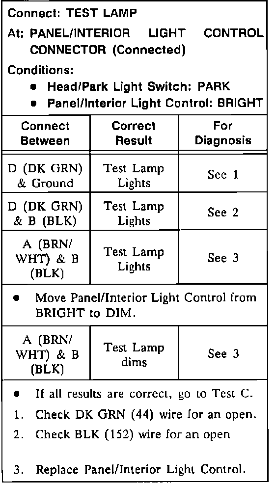Test B Panel/Interior Light Control Test