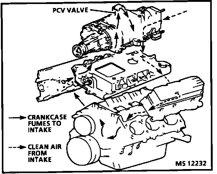 The PCV system prevents blow-by gases from escaping to atmosphere by routing them through a vacuum controlled ventilation valve, into the intake manifold. The blow-by gases combine with the air/fuel mixture and are burned in the combustion chamber. When the engine is running, fresh air is drawn into the crankcase through a tube or hose connected to the air cleaner housing.