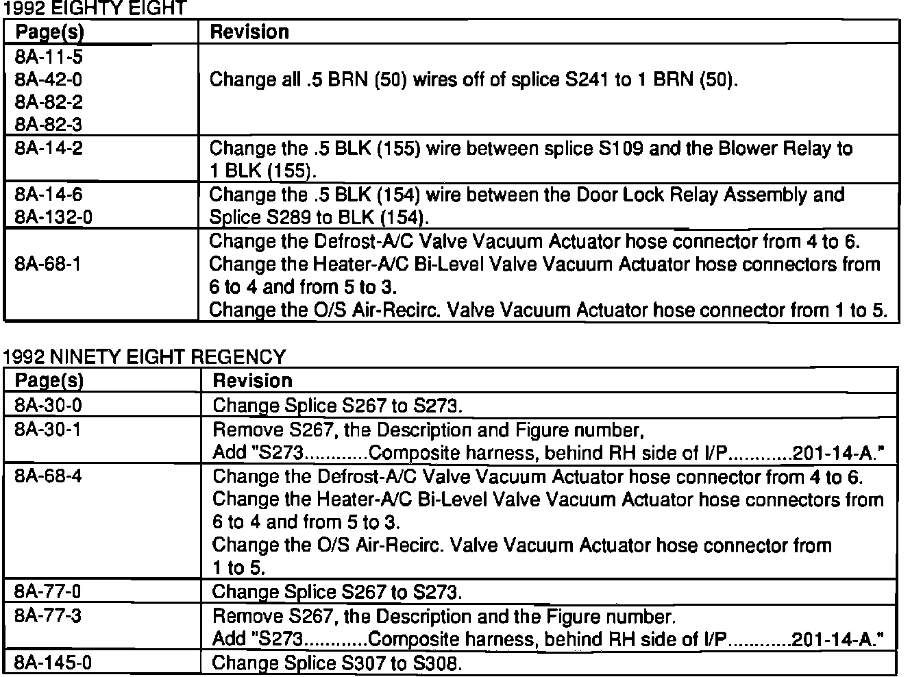 Where page numbers are given, they are the original 1992 Eighty Eight or Ninety Eight Service manual page number. Please mark a reference to this bulletin in your copy of the affected service manual and write-in the revised information given in the update change summaries.