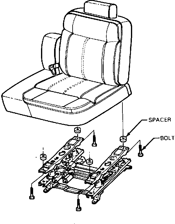 2. Remove the four (4) hexhead bolts attaching the seat frame to the adjuster. On vehicles with the 6- way power seat option, the adjuster must be in the full "up" position to remove these bolts.