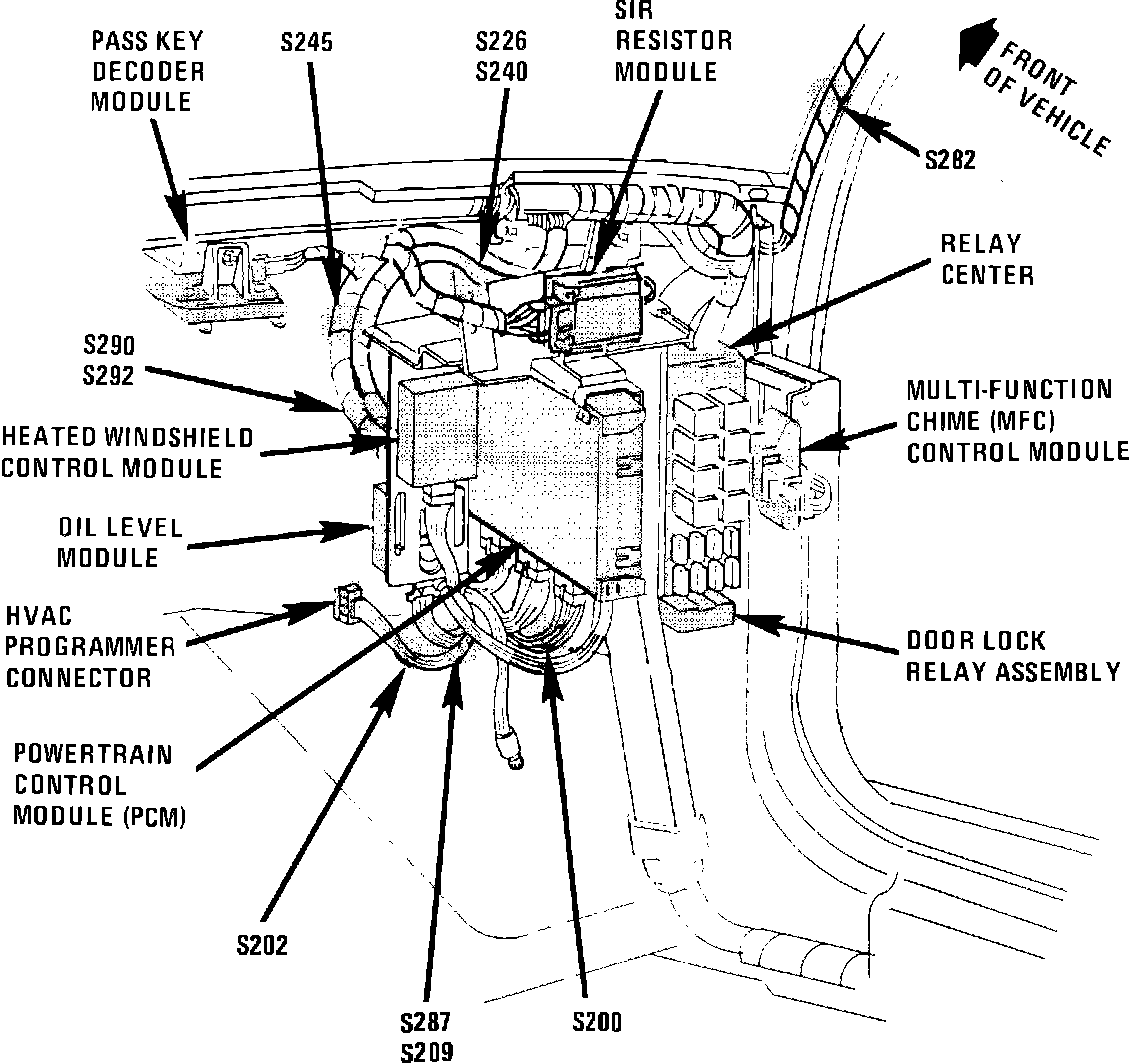 Behind RH side of I/P, left of Powertrain Control Module (PCM)