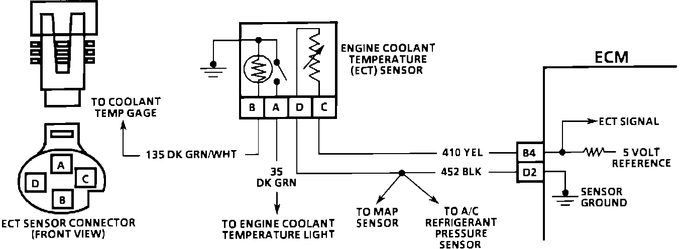 The Engine Coolant Temperature (ECT) sensor utilizes a thermistor to control the signal voltage to the Engine Control Module (ECM). The ECM applies a reference voltage on CKT 410 to the sensor. When the engine is cold, the sensor (thermistor) resistance is high. The ECM will then sense a high signal voltage.