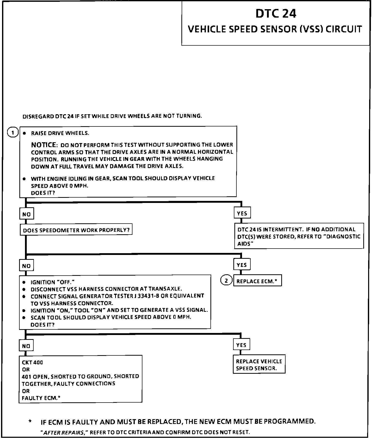 Disregard a DTC 24 that sets when the drive wheels are not turning. This can be caused by a faulty PNP switch circuit. The PM generator only produces a signal if the drive wheels are turning greater than 3 mph.