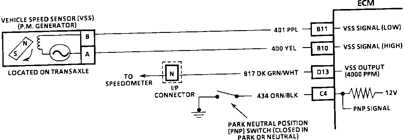 The function of VSS buffer used in past model years has been incorporated into the ECM. The ECM then supplies the necessary signal to the instrument panel (4000 pulses per mile) for operating the speedometer and the odometer.