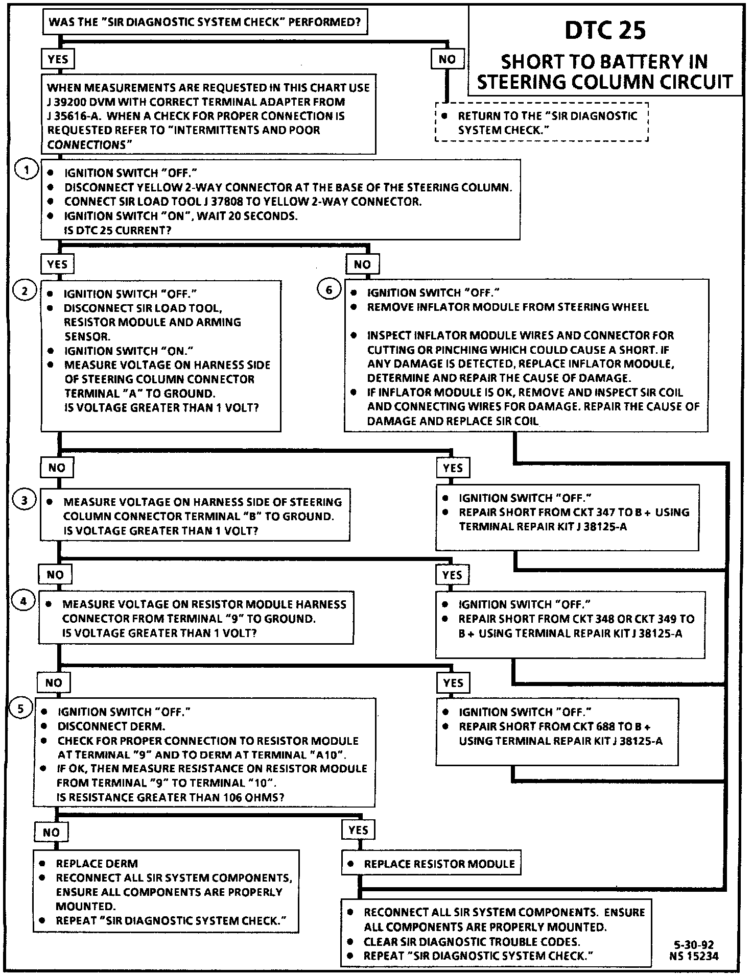 DTC 25 will set if the voltage at the "Sense Low" input, terminal "A6," is within a specific range of "Ignition 1" voltage during the first portion of the "Steering Column Resistance Test."