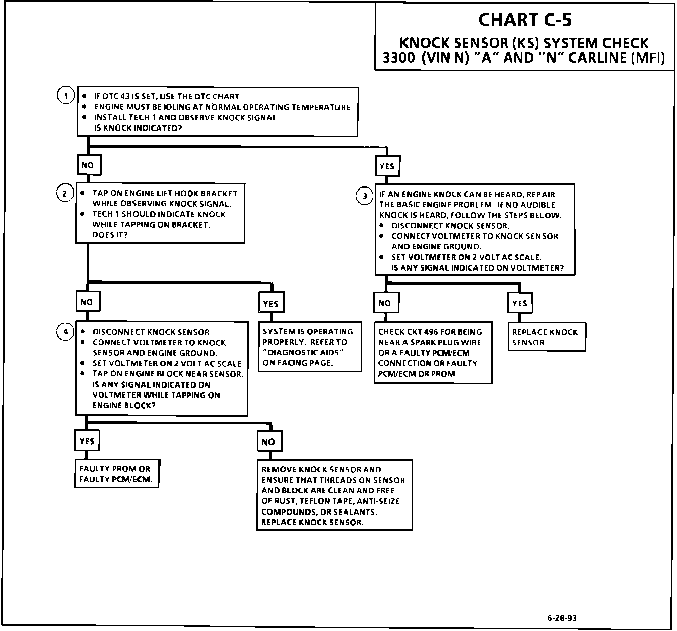 The revised C-5 Knock Sensor System Chart information should be used when diagnosing the knock system on 1993 Cutlass Ciera and Achieva models with the 3300 (VIN N - RPO LG7) MFI engine. Please update page 6E3-C5-5 of your copy of the 1993 Cutlass Ciera and Achieva Service Manual.