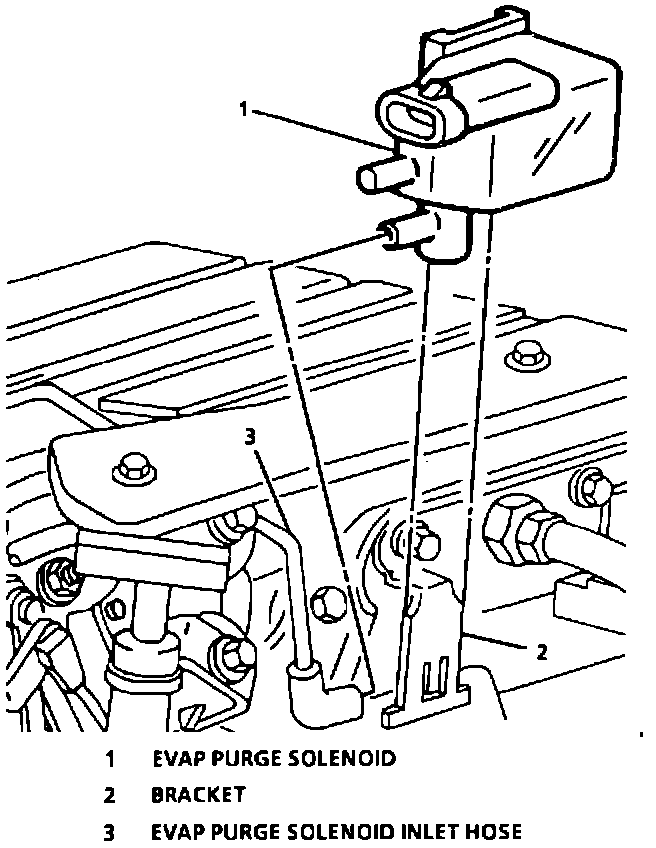 1. Install solenoid to engine bracket. Snap the EVAP purge solenoid down over the lock tabs of the bracket.