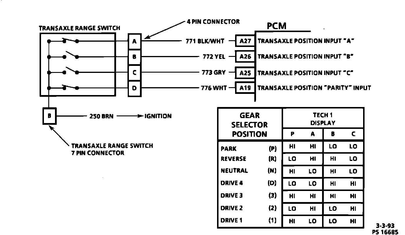 The gear select switch actually contains four switches. The PCM detects the desired gear range by monitoring which combination of switches is "ON" or "OFF" (see illustration.)