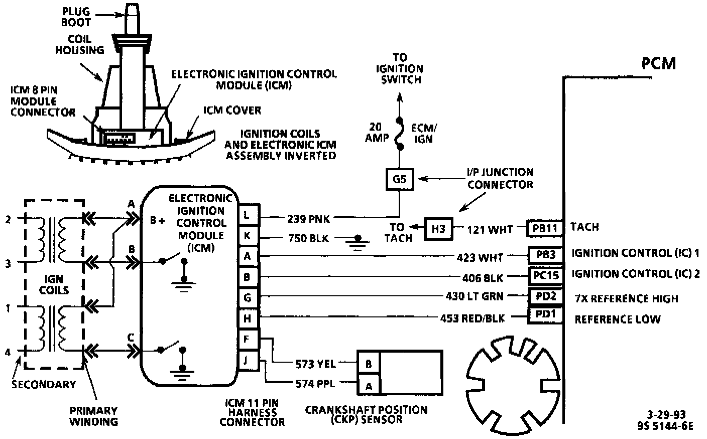The electronic Ignition Control Module (ICM) sends a reference signal to the Powertrain Control Module (PCM) seven times per revolution to indicate crankshaft position and RPM so that the PCM can determine when to pulse the ignition coils and control ignition timing. This signal is called the 7X reference because it occurs seven times per revolution. The ICM applies 5 volts from terminal "G", through CKT 430 to PCM terminal "PD2" and in effect, switches this circuit to ground for a very short period of time. The seventh pulse is the sync pulse and is used for crankshaft position reference.
