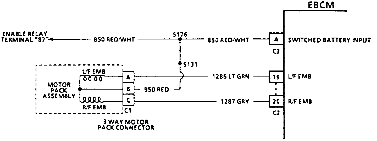 Current is supplied to the Electromagnetic Brake's (EMB) through terminal "B" of the three way motor pack connector. When a release of the EMB is commanded, the Electronic Brake Control Module (EBCM) grounds the EMB input and allows the EMB to be energized to release the motor.