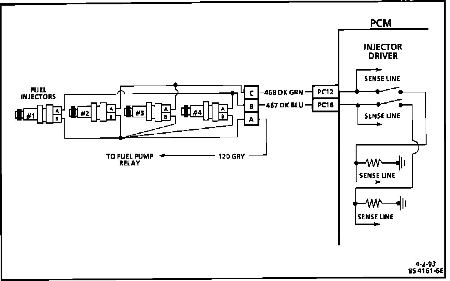 The Powertrain Control Module (PCM) has two injector driver circuits, each of which controls a pair of injectors (1 and 4 or 2 and 3). The PCM monitors the current in each driver circuit by measuring voltage drop through a fixed resistor and is able to control it. The current through each driver is allowed to rise to a "peak" of 4 amps to quickly open the injectors, and is then reduced to 1 amp to "hold" them open. This is called "peak and hold." if the current can't reach a 4 amp peak, DTC 65 is set as noted below. This DTC is also set if an injector driver circuit is shorted to voltage.
