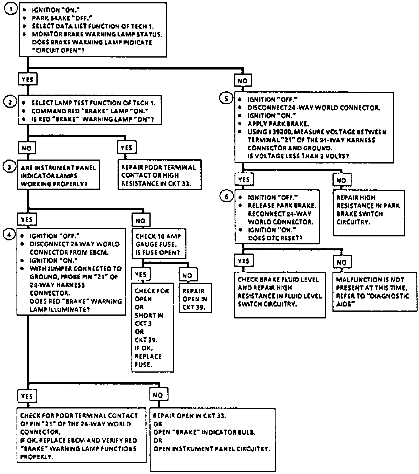 The frequency of the malfunction can be checked by using the enhanced diagnostic function of the Tech 1. If the Tech 1 is not available, the parking brake handle may be lifted to verify proper lamp operation and continuity of CKTs 3 and 39.