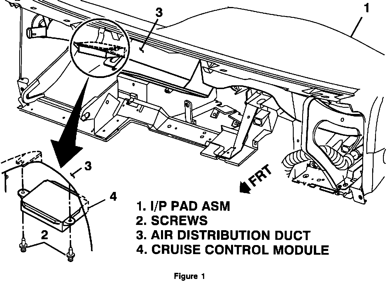 The location of the cruise control module has been incorrectly illustrated in Section 9B, Figure 9, of the Service Manual. The correct location is shown in Figure 1 of this bulletin. The remove and replace procedures for the cruise control module are correct in Section 8C of the Service Manual.