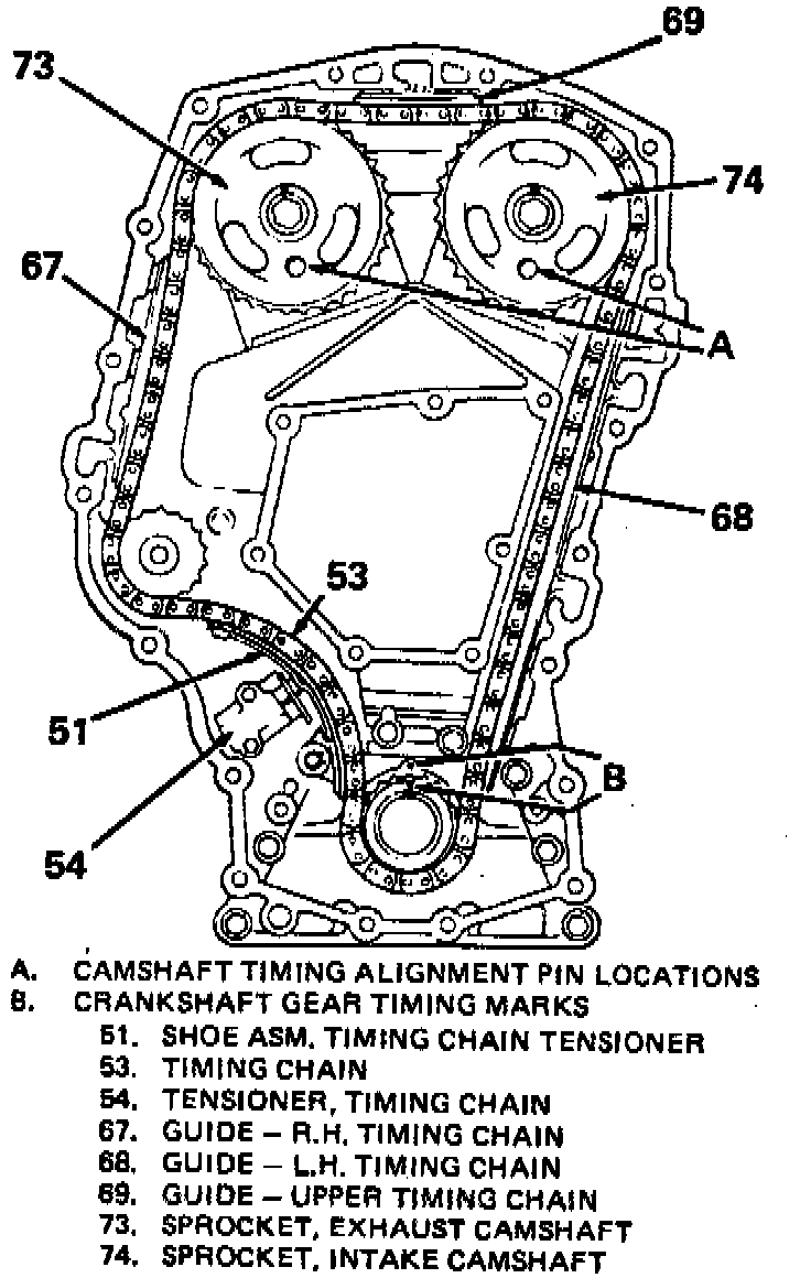 3. On DOHC engine, place timing chain cover exhaust camshaft sprocket, idler sprocket and crankshaft sprocket. Then remove timing pin from intake camshaft and attach camshaft sprocket tool No. J-36013, or equivalent, to camshaft sprocket. Using camshaft sprocket wrench, rotate camshaft sprocket counterclockwise until timing chain can be installed over sprocket. Release tool after timing chain has been installed over sprocket. The timing chain tension between intake and exhaust camshaft sprockets should tighten. The timing pin should easily fit through intake camshaft sprocket timing hole into timing chain housing timing hole. If timing pin does not fit easily, repeat procedure.