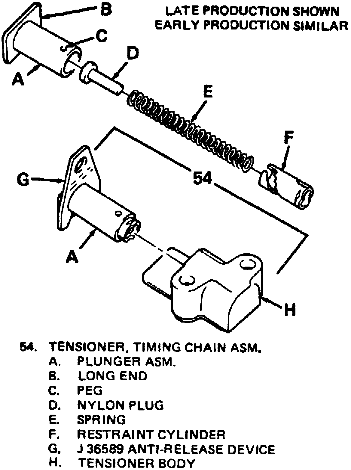 e. Install tensioner assembly to chain housing and recheck plunger assembly installation, noting long end is toward crankshaft.
