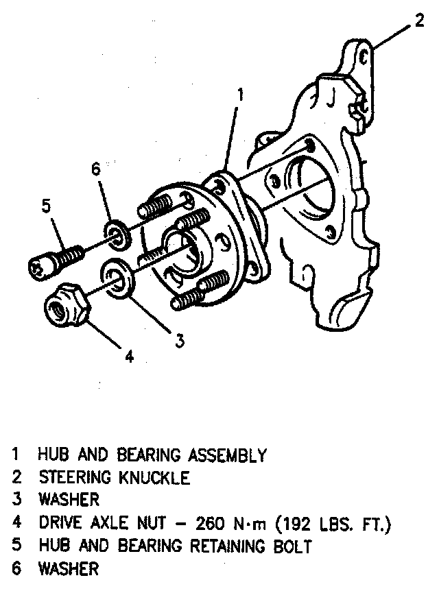 2. Hub and bearing assembly to steering knuckle. Tighten hub and bearing assembly bolts to 95 Nm (70 lb ft).