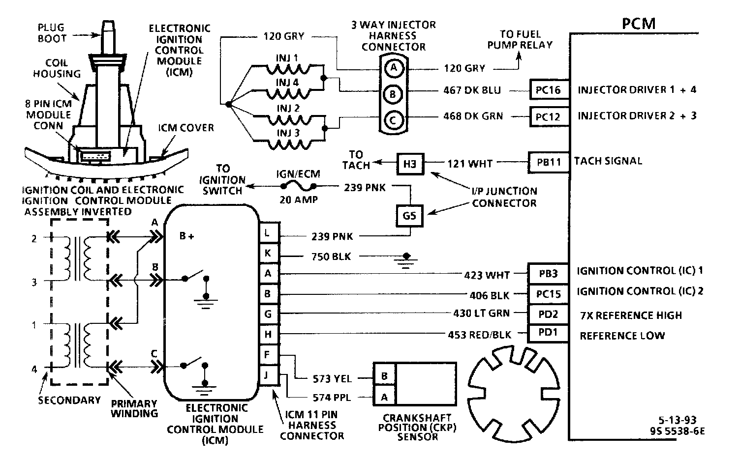 This engine is equipped with a distributorless ignition system called the Electronic Ignition (EI) system. The primary circuit of the EI system consists of two separate ignition coils, an electronic Ignition Control Module (ICM) and Crankshaft Position (CKP) sensor as well as the related connecting wires and the Ignition Control (IC) portion of the Powertrain Control Module (PCM). Each secondary circuit consists of the secondary winding of the coil, two connecting metal strips molded into the coil housing, the spark plug boot/connector assemblies and spark plugs.