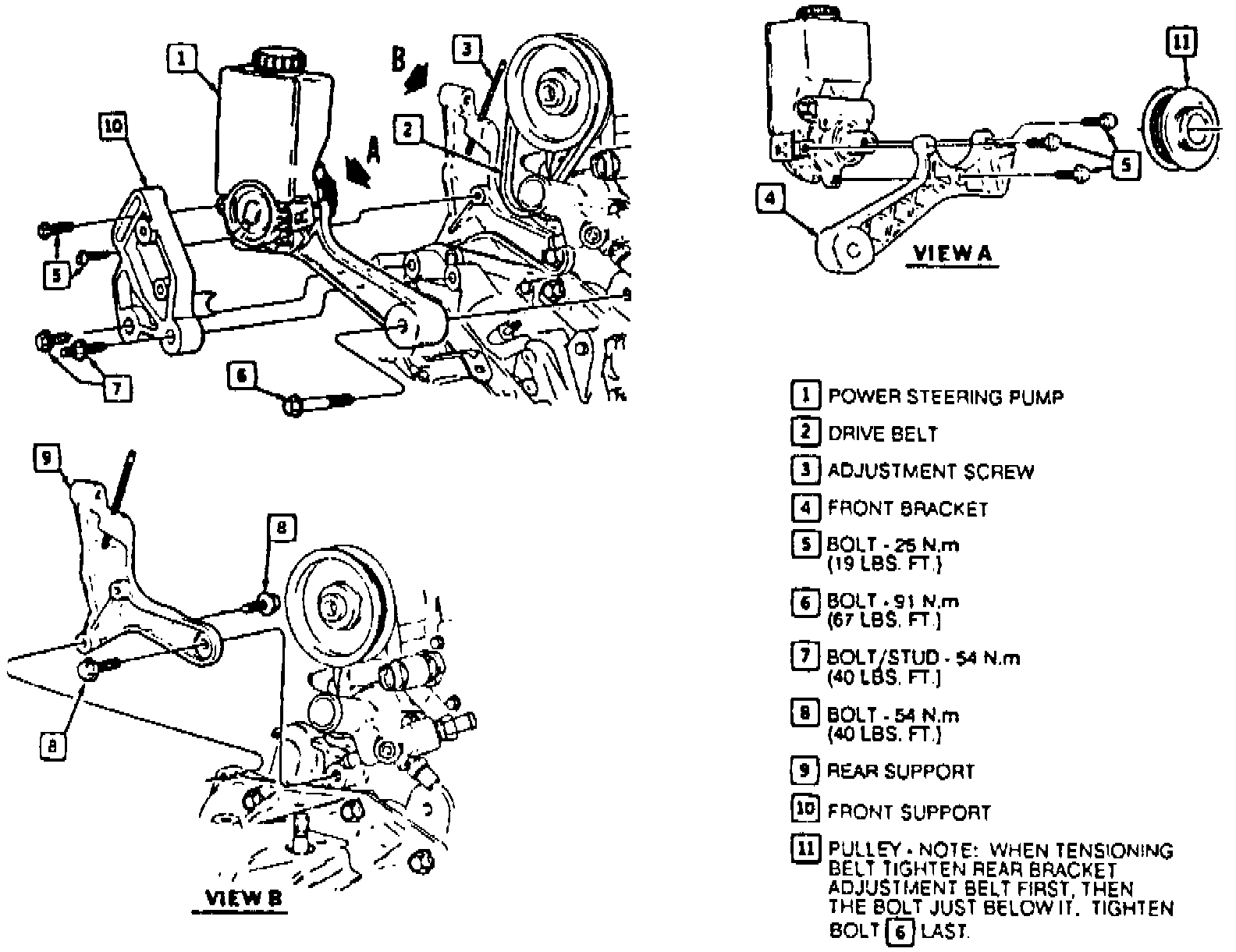 1. Disconnect pressure and return lines from power steering pump. Allow fluid to drain into a suitable container.