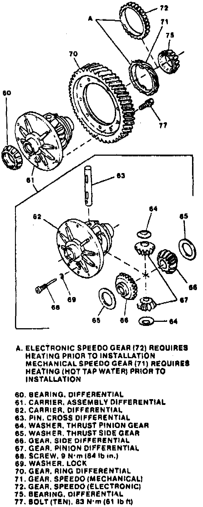 Heat the mechanical nylon speedometer drive gear (71) in hot tap water for approximately five minutes prior to installation. Heat the electronic steel speedometer drive gear in an oven at 250°F for seven to ten minutes prior to installation.